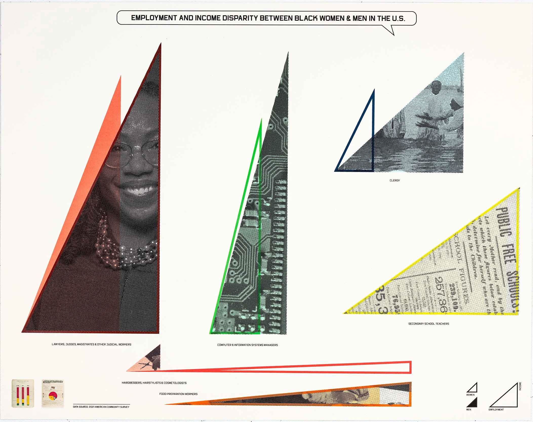 Employment and Income Disparity Between Black Women and Men in the U.S. Screenprint, chine collé, and archival pigment print on Saunders Waterford paper. 22 x 28 inches. ©Villalongo Studio LLC. Courtesy William Villalongo, Shraddha Ramani and Island Press, St. Louis, MO.
