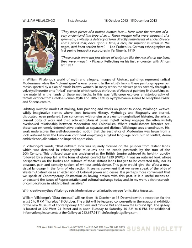 Orbiting multiple modes of making, from painting and works on paper to video, Villalongo weaves wildly imaginative scenes where lines between History, Mythology and Biography are blurred, dislocated, even profaned. Ever concerned with origins as a view to marginalized histories, the artist's current body of work and third solo exhibition at Susan Inglett Gallery engages the often willfully overlooked relationship between Modernism and Colonialism. Where establishment histories see these two extremely determinative periods as separate and distinct, Villalongo sees a continuum. His work underscores the well-documented notion that the aesthetics of Modernism was hewn from a look outward from the European continent employing a hybrid language born out of conflict, desire, ambivalence, alienation and Imperial oppression.