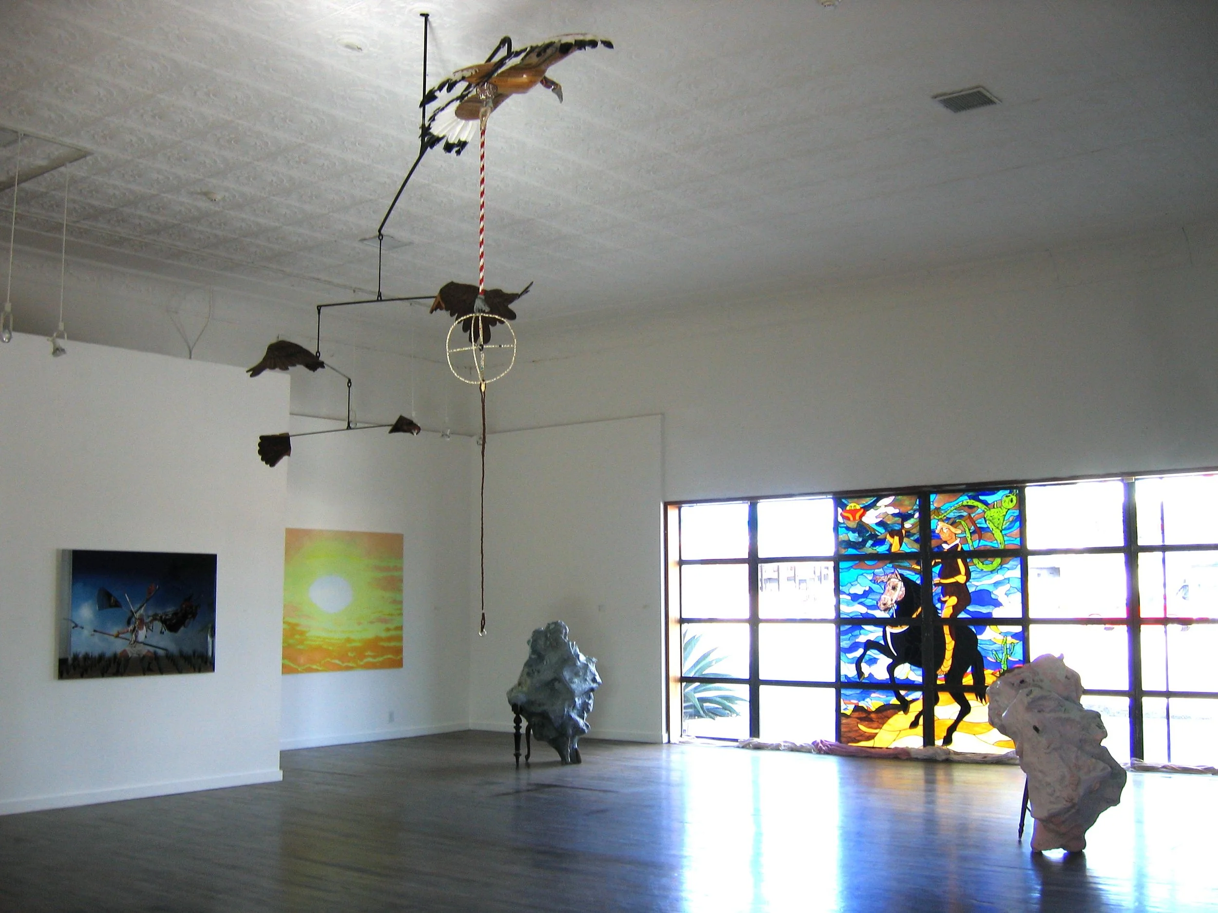 This 72” x 82” Stained glass work was originally commissioned by Ballroom Marfa for its winter 2006 exhibition Your Are Here. You Are Here, the first group exhibition devoted to emerging artists whose work was informed by their experience of urban and suburban life in contemporary American culture. Through the visions of SunTek Chung, Larry Bamburg, Deborah Grant, Andrew Guenther, Hilary Harnischfeger, Adam Helms, Matthew Day Jackson, Karyn Olivier, Sigrid Sandstrom, Allison Smith, Ian Sullivan, Will Villalongo, Roger White, Raphael Zollinger, and an exhibition essay by Mary Robbins, this exhibition sought to address a collective and individual response to a particular moment in time: artists as social and cultural cartographers. These artists illustrated the spectrum of actual and emotional locations that create an ideological map of where we were. They represented all locations, both narrative and symbolic; the dream world, paranoid conformity, urban claustrophobia, suburban alienation, ephemeral monuments, propaganda, anonymous intimacy and finally the reinvention of the American frontier.